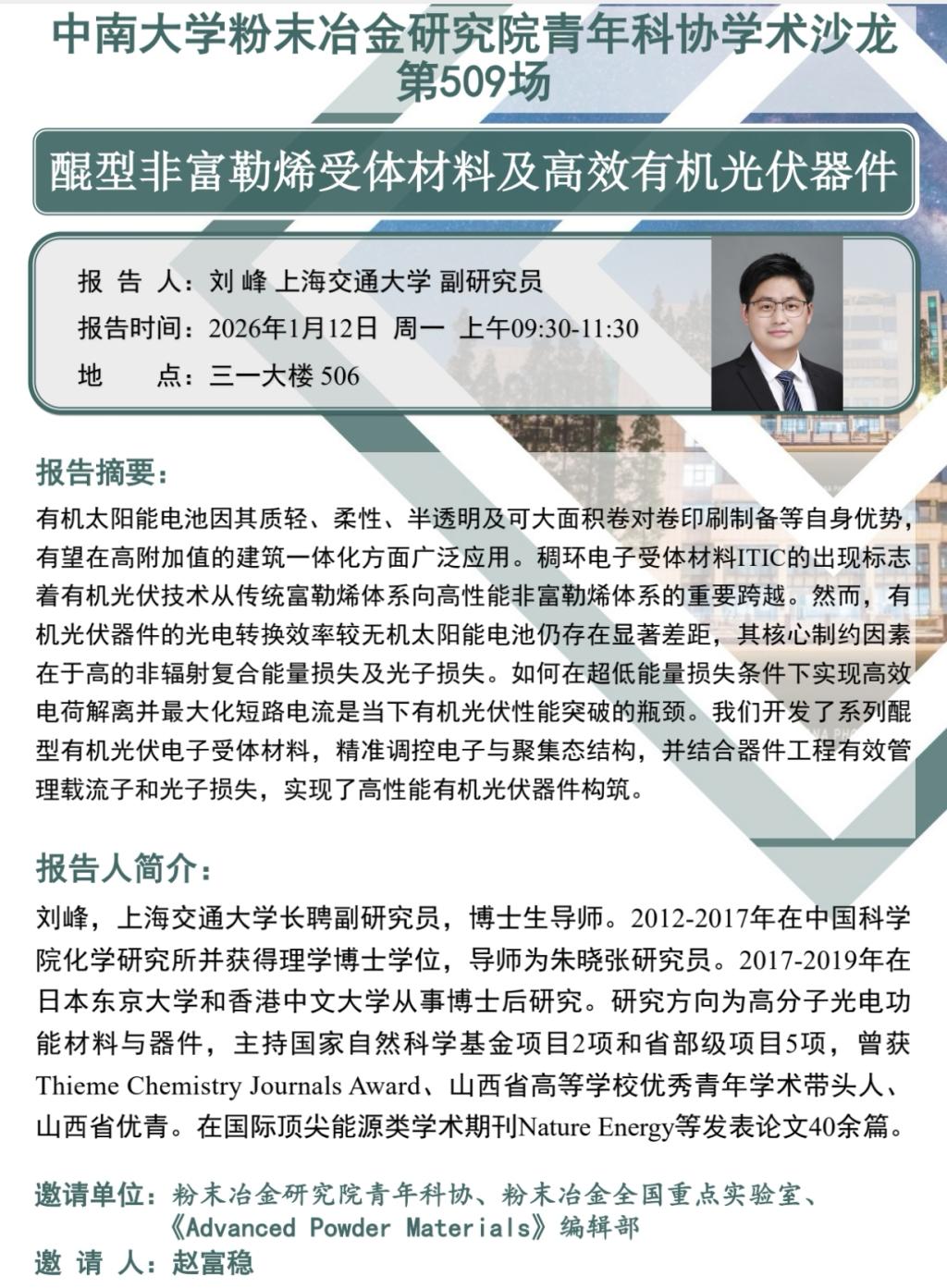 刘峰,上海交通大学长聘副研究员,博士生导师。2012-2017年在中国科学院化学研究所并获得理学博士学位,导师为朱晓张研究员。2017-2019年在日本东京大学和香港中文大学从事博士后研究。研究方向为高分子光电功能材料与器件,主持国家自然科学基金项目2项和省部级项目5项,曾获Thieme Chemistry Journals Award、山西省高等学校优秀青年学术带头人山西省优青。在国际顶尖能源类学术期刊Nature Energy等发表论文40余篇