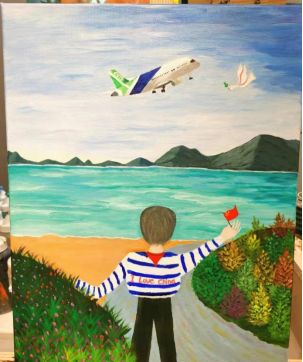 谭彦妮同志的画作灵感来源便是出于此,她说,身为中南粉冶人,为大飞机的中南元素感到由衷的自豪。油画作品主要由三部分组成,蔚蓝的天空、青翠的山峰、广阔的江河泛起碧波、花草相间摇曳风姿作为背景,描绘的是祖国的“绿水青山”;国产大型客机直冲云霄,而天空近处飞来一只衔着橄榄枝的白鸽,象征着中国航空事业的腾飞与世界和平;戴着红领巾的小男孩手中举着五星红旗,蓝色条纹的衬衫上写着“我爱中国”,表达了对祖国的无限热爱和对未来充满希望。