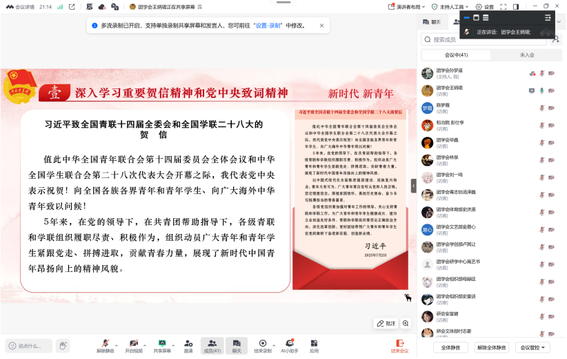 2025年8月17日,全讯600cc大白菜学生会、研究生会通过线上平台,组织召开专题学习会学习贯彻习近平总书记重要贺信精神和党中央致词精神,传达学习全国青联十四届全委会和全国学联二十八大精神。分团委书记彭仕亨、常务副书记文天骐,学生会、研究生会全体学生干部参会。