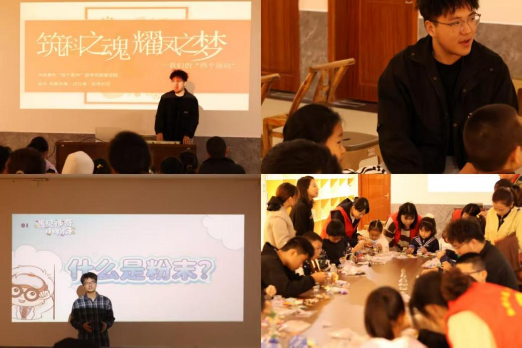 活动中,宣讲员林泉结合专业背景,为孩子们详细讲解了粉末冶金基础知识,将我院特色科普资源“高校星火馆”带进社区。为将抽象原理具象化,活动特别设置了“彩虹沙画瓶”实践环节。孩子们在宣讲员们的指导下亲手向瓶子中填入彩沙、压实成型,模拟“粉末填充”与“模压成型”过程,在趣味互动中直观感受材料科学的魅力,实现了理论与实践的巧妙融合。