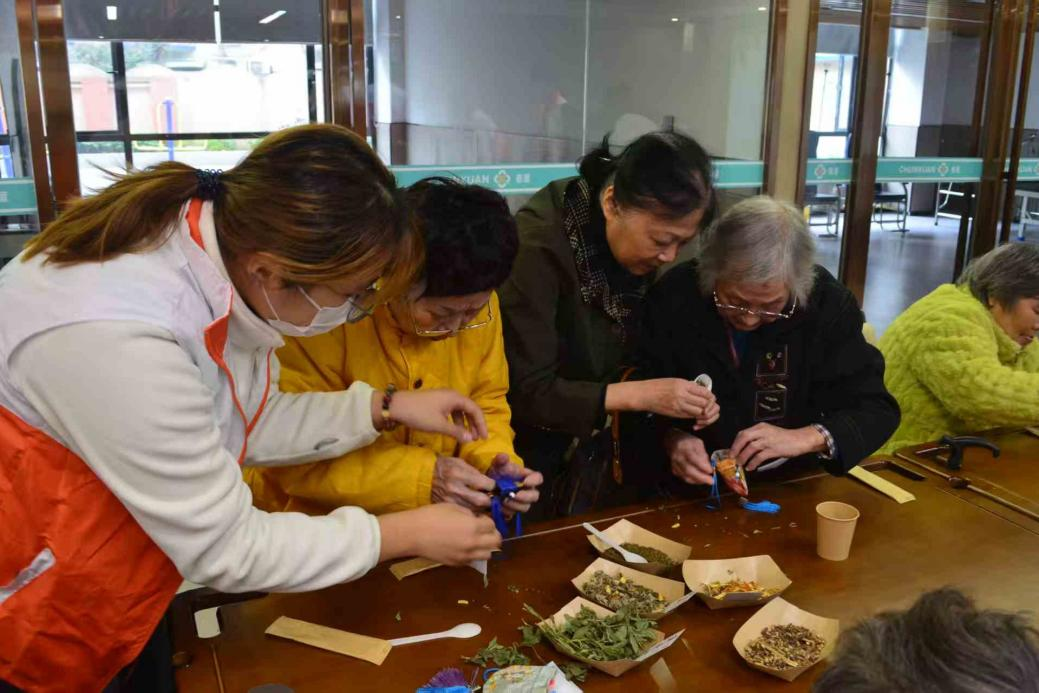 而后的互动环节内容丰富、形式多样。“击鼓传福”游戏中,老人们在志愿者引导下传递象征吉祥的福气道具,接到道具的长者向老友和工作人员送上诚挚祝福,并获赠志愿者们精心准备的礼品。在手工制作中,老人们亲手制作“茱萸菊花安康香囊”,从装填药材到系绳收口,每一步都凝聚着对健康平安的美好祈愿。压轴的“小球传递比赛”更将活动气氛推向高潮,老人们团结协作、踊跃参与,现场欢笑声此起彼伏,洋溢着活力与温情。