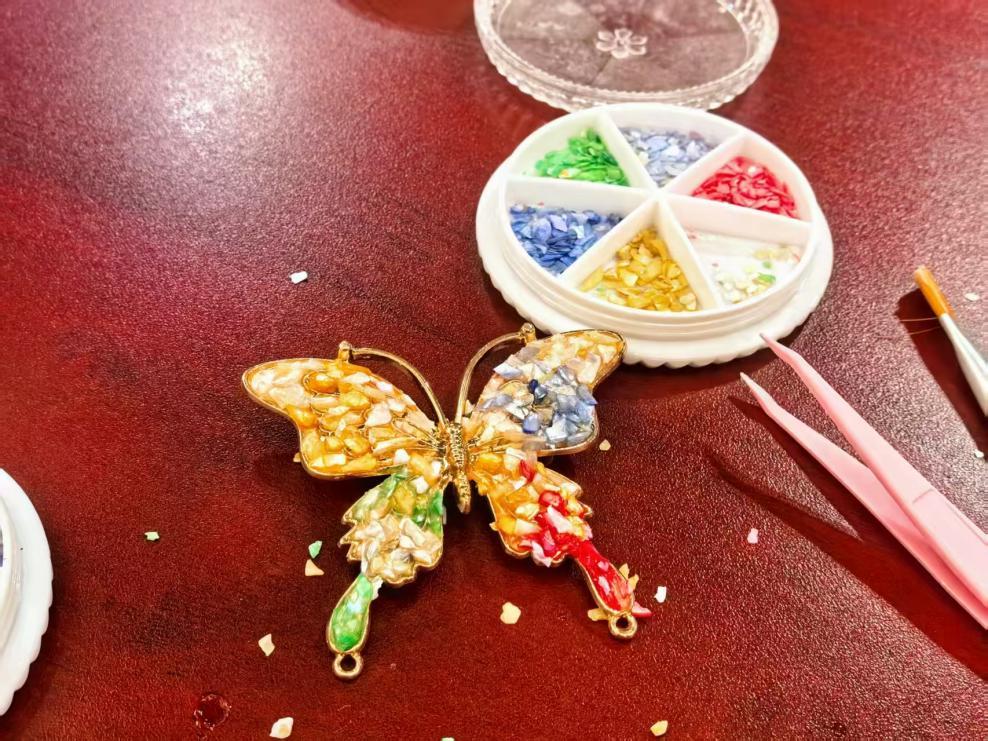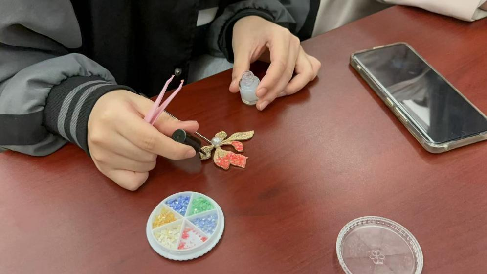 活动伊始,文艺部成员为大家详细讲解了螺钿工艺的历史渊源与制作技巧。随后,在场同学纷纷动手实践,从构图到粘贴,大家在蝴蝶、花卉等造型的金属基底上,精心镶嵌五彩螺片,制作出螺钿发簪、胸针等一件件独具匠心的作品。